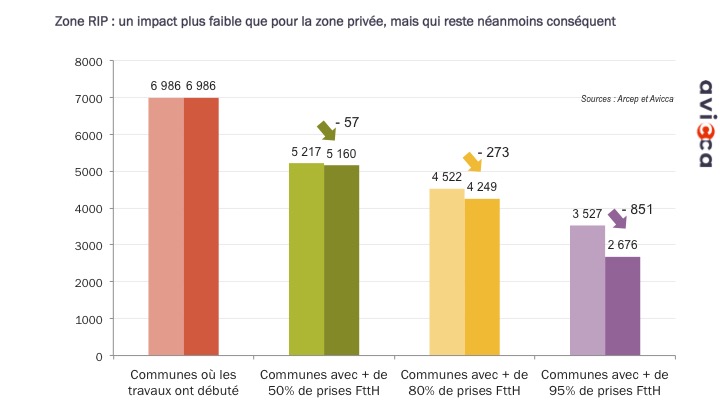 Dans les RIP, on compte désormais presque 482 000 locaux supplémentaires à raccorder. Le changement de base impacte fortement le niveau de complétude des communes présentes dans ces zones, mais moins que dans les zones privées.