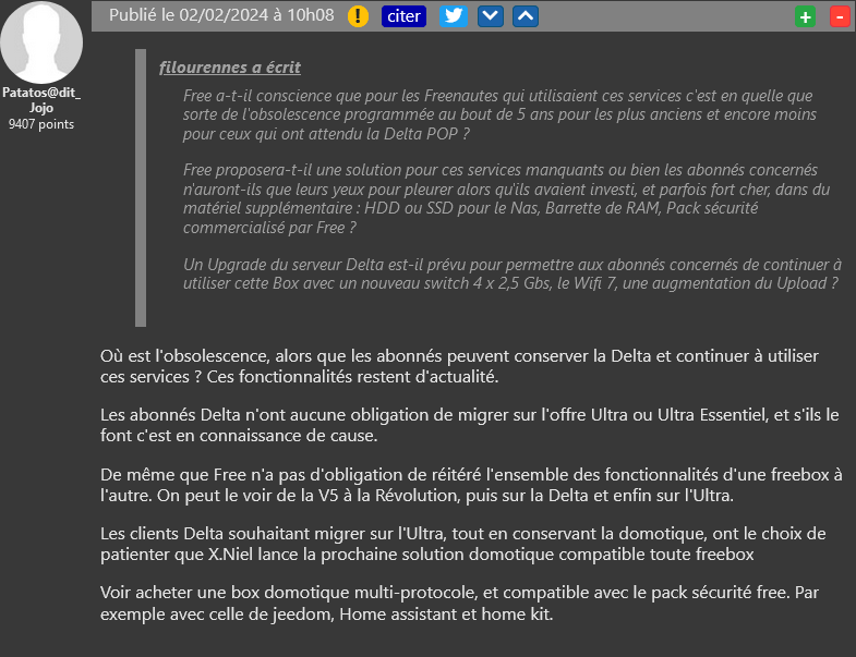 La Freebox Ultra se veut entre autres ultra-simple. En cela, elle dénote de la Freebox Delta qui apportait énormément de nouveauté innovantes en 2018. Si des changements de tailles sont au programme avec le WiFi 7, le 8Gbit/s ou même simplement le fait de tripler les heures d’enregistrement, certains considèrent qu’ils perdent trop de fonctionnalités, notamment en domotique, par rapport à la Delta. Cela tombe bien, rien ne force les abonnés à y passer, comme le rappelle un Freenaute.