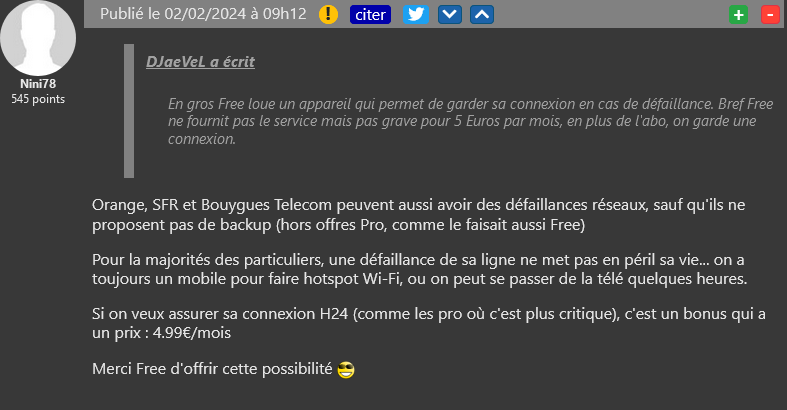 En marge du lancement de la Freebox Ultra, le fondateur de Free, Xavier Niel, a révélé le lancement “d’ici quelques jours” d’un nouveau backup 4G à connecter à cette nouvelle box en cas de perte de connexion internet. Ce nouveau modem de secours est aujourd’hui mentionné dans la nouvelle brochure tarifaire Freebox de l’opérateur mise en ligne le 30 janvier 2024. En l’analysant, il s’avère que ce backup 4G rond aux allures du répéteur WiFi de Free, à ne pas confondre avec le Pocket WiFi de la Freebox Ultra, sera également disponible pour tous les abonnés Freebox Révolution, Pop, mini 4K, Delta, One, sauf Crystal. Son prix est également connu, celui-ci sera proposé à 4,99€/mois. Celui-ci sera “mis à disposition sur demande et après diagnostic”, précise l’opérateur. Certains plutôt pessimistes y voient une façon de se dédouaner de problèmes de connexion, quand d’autres y voient un service plutôt sympathique surtout en cas de ligne instable. A vous de trancher.