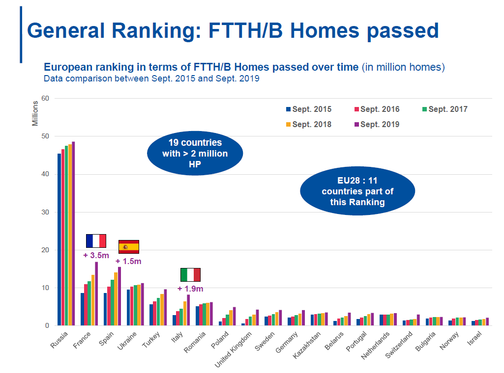 En effet, en septembre 2019 la France prend la première place des 28 pays d’Europe pris en compte dans l’étude, en ce qui concerne le nombre de foyers raccordés. Elle dépasse ainsi l’Espagne, qui était à cette première place les années précédentes. A noter que sont prises en compte les connexions FTTH (fibre jusqu’à l’abonné) ainsi que les connexion FTTB (fibre jusqu’en bas de l’immeuble) et que la France utilise principalement cette première technologie.