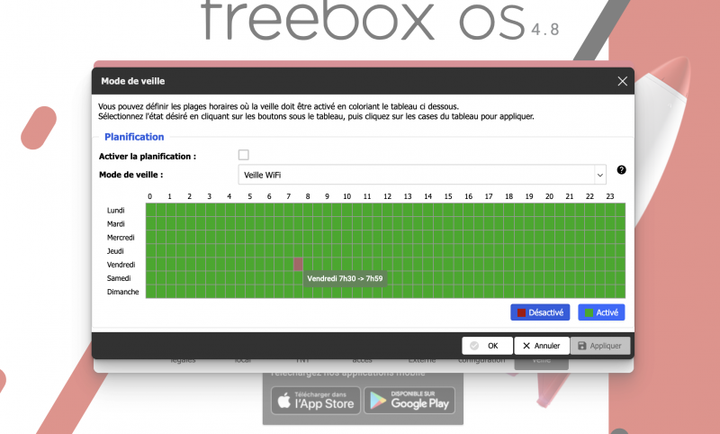 Autre nouveauté, l’apparition de la gestion du mode veille WiFi et mode veille totale dans les paramètres Freebox, vous pouvez définir les plages horaires où la veille doit être activé en coloriant le tableau présenté.