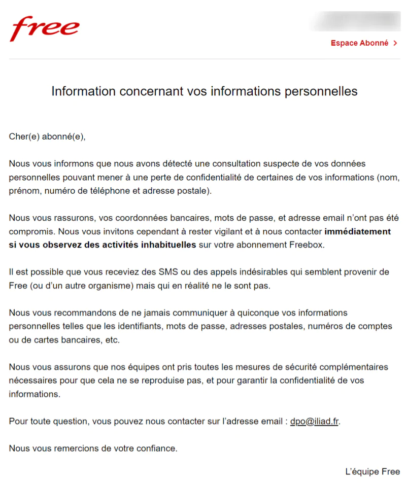 Depuis ce soir, de nombreux abonnés Freebox nous transfèrent un mail que leur a envoyé Free. Les mêmes témoignages sont postés sur le forum d’Univers Freebox. Dans ce message, intitulé “Information concernant vos informations personnelles” l’opérateur indique avoir “détecté une consultation suspecte de vos données personnelles pouvant mener à une perte de confidentialité de certaines de vos informations (nom, prénom, numéro de téléphone et adresse postale)” et de préciser qu’il faut le “contacter immédiatement si vous observez des activités inhabituelles sur votre abonnement Freebox.”