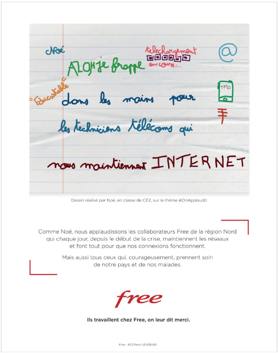 C’est ainsi que l’on peut retrouver dans le Courrier Picard de ce 28 avril, une publicité de Free avec un dessin d”enfant, réalisé par le petit Noë sur le thème #OnApplaudit. Il a choisi de rendre hommage aux techniciens télécoms, grâce à qui les réseaux peuvent être maintenus durant cette crise sanitaire. Free profite de ce message pour rendre également hommage “à tous ceux qui, courageusement, prennent soin de notre pays et de nos malades”. Le message est cette fois-ci encore détourné du slogan historique de Free : “Ils travaillent chez Free, on leur dit merci.”