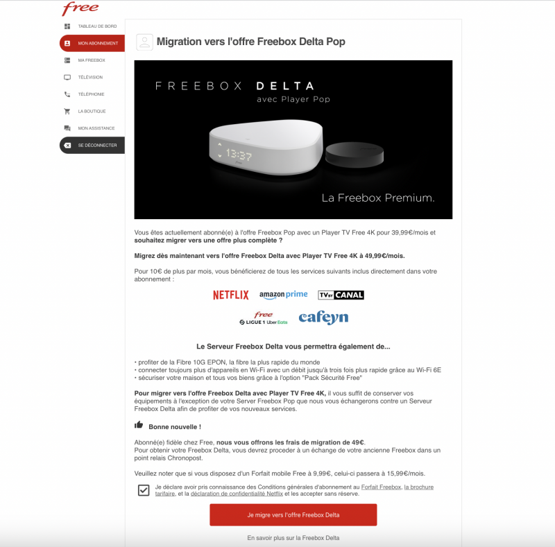 Les abonnés Freebox Pop ayant plus de 5 ans d’ancienneté se voient toujours offrir les frais de migration. Le 30 janvier dernier, le fondateur de Free, Xavier Niel, a annoncé au cours d’une interview accordée à Tech&Co : “la Freebox Delta, on va la voir revenir”. Reste à savoir s’il s’agit de cette disponibilité migration ou si Free a une autre idée derrière la tête. Aujourd’hui, plus d’1 million de Freebox Delta sont en circulation mais Free a arrêté leur production à la fin de l’année 2023.