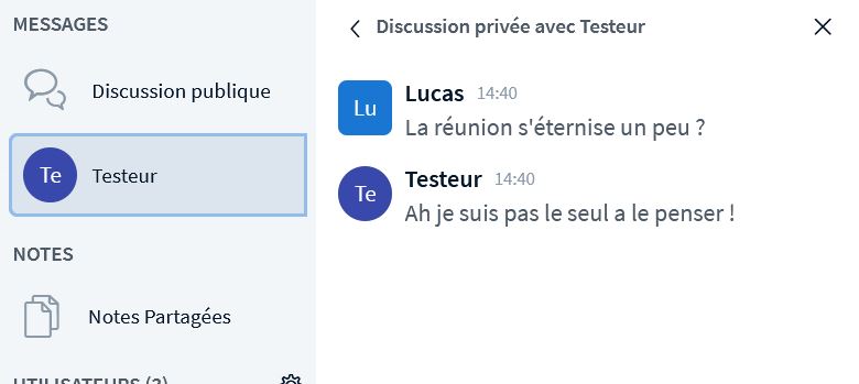 Il existe évidemment la possibilité de discuter en chat, tant dans une discussion publique avec tous les participants, qu’en discussion privée.