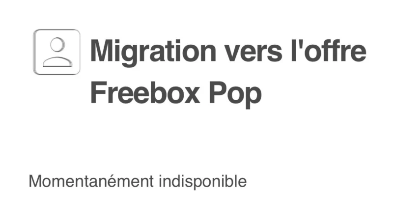 Encore un problème de stock ? Les abonnés Freebox Révolution, mini 4K, One ou Crystal désireux de migrer aujourd’hui vers la Freebox Pop devront prendre leur mal en patience. Sur leur espace abonné, Free les informations que la migration vers sa box de milieu de gamme est “momentanément indisponible”, sans plus d’explications. L’hypothèse de la gestion des stocks du Player Pop rebaptisé Player TV Free 4K, n’est pas à exclure bien que l’opérateur ne communique pas sur la raison de cet arrêt temporaire.