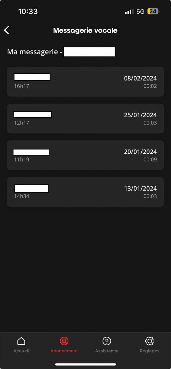 Pour cela, il vous suffit de vous rendre dans la section abonnement et de cliquer sur “messagerie vocale”, vous pourrez ainsi écouter un message, le télécharger, le supprimer ou rappeler directement votre interlocuteur. Les messages sont triés du plus récent au plus ancien.