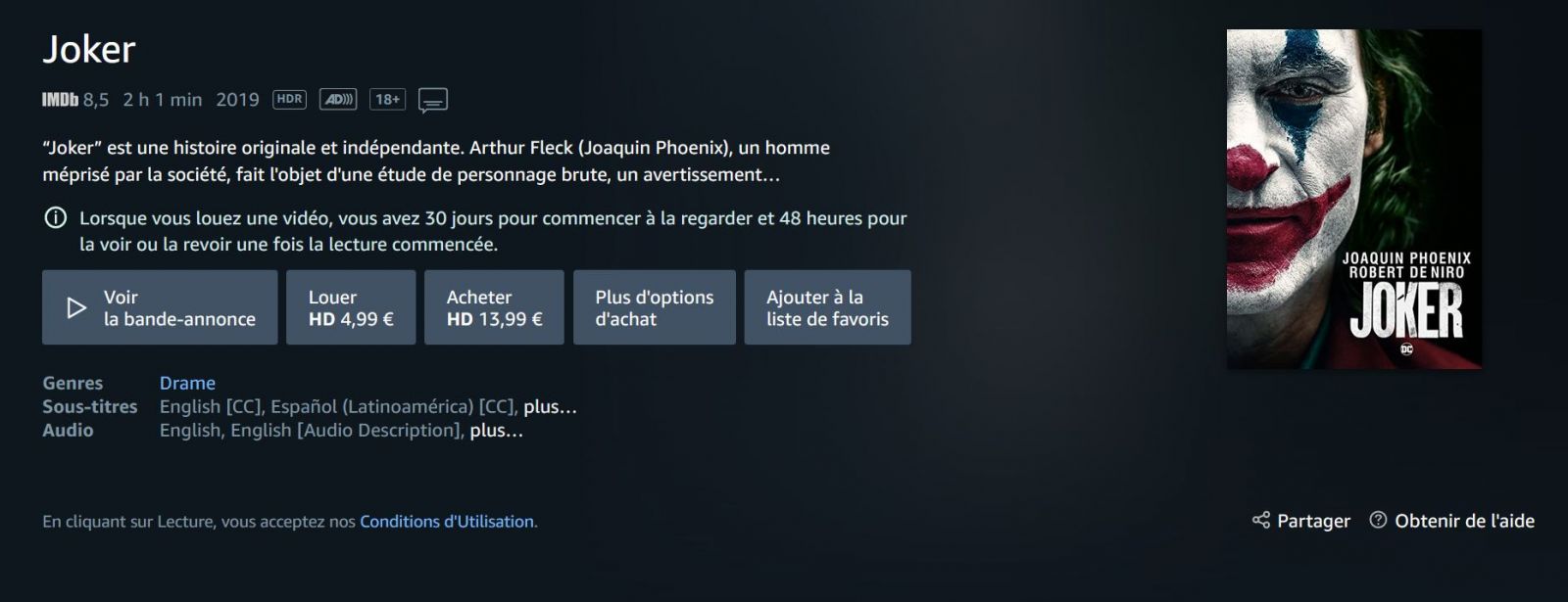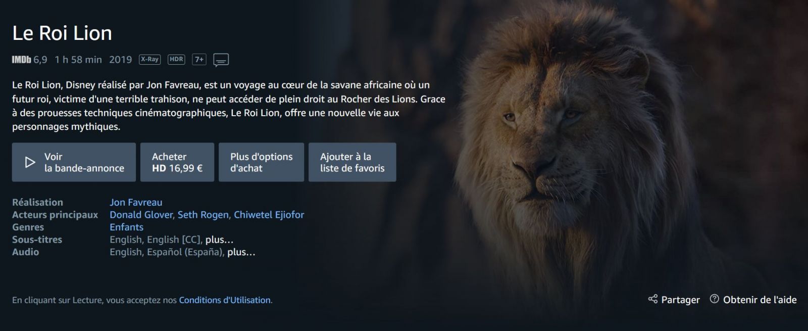 Avec le possibilité d’achat et de location de films, cette limite est ainsi dépassée (avec une attente de 4 mois après obtention du visa d’exploitation) et vous pouvez ainsi regarder des oeuvres plus récentes comme le Roi Lion (de 2019) ou Joker, directement sur votre Freebox. A noter qu’il faudra avoir associé un moyen de paiement à votre compte Prime Video pour effectuer ces achats, sans quoi un message d’erreur apparaîtra.