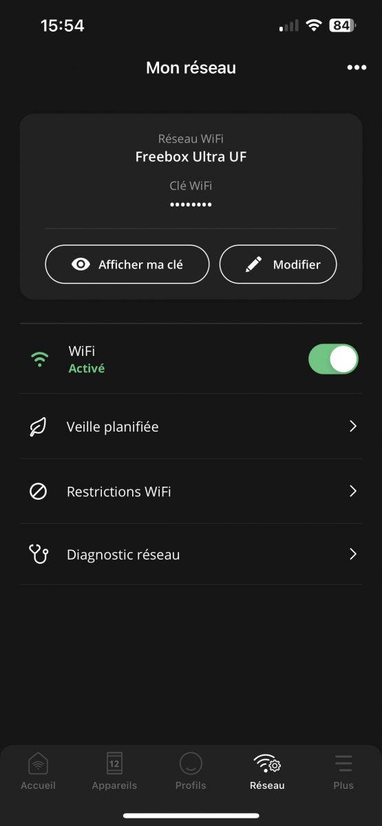 Il est ainsi possible de planifier facilement les périodes durant lesquelles votre Freebox entrera dans un profond sommeil. Deux outils peuvent être utilisés au choix, le premier étant Freebox Connect, application gratuite disponible sur le Play Store et l’App Store. Une fois connecté à votre réseau Freebox, il vous suffira de vous rendre dans la section WiFi de l’application via le bandeau en bas de votre écran.