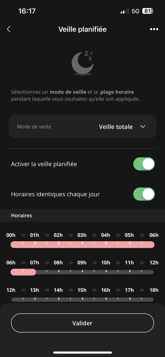 Il vous sera ensuite proposé de choisir un mode de veille, optez donc pour la veille totale, puis cochez les horaires qui vous intéressent.