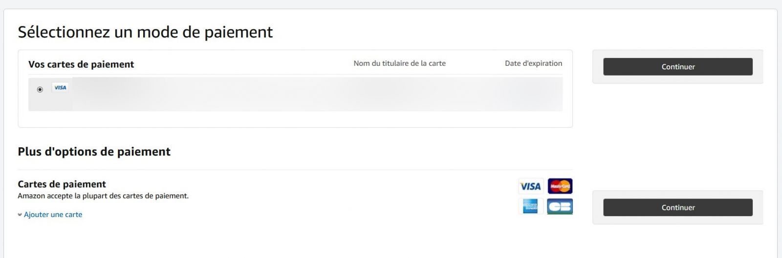 Il vous est directement proposé d’utiliser le même moyen de paiement que vous utilisez pour vos livraisons sur Amazon par exemple, mais vous pouvez également saisir les données d’une autre carte bancaire si vous le souhaitez.