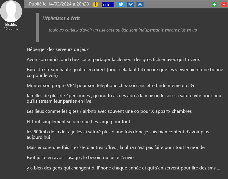 Depuis la Freebox Révolution, Free intègre la fonctionnalité DECT dans ses box haut de gamme. Cela permet de connecter jusqu’à 8 combinés téléphoniques sans fil directement à la Freebox, pour passer et recevoir les appels fixe. Avec cette fonctionnalité il n’y a donc plus besoin de connecter de base à l’arrière de la Freebox. Mais, la fonctionnalité DECT n’est pas disponible sur la Freebox Ultra. Une autre fonctionnalité qui disparaît par rapport à la Freebox Delta, ce qui laisse chez certains Freenautes un arrière-goût amer, au point de déclarer que les plus grosses évolutions sont assez inutiles, notamment du point de vue des débits impressionnants en upload. Mais d’autres, comme kisskiss ont en tête plusieurs points sur lesquels la Freebox Ultra peut être très utile.