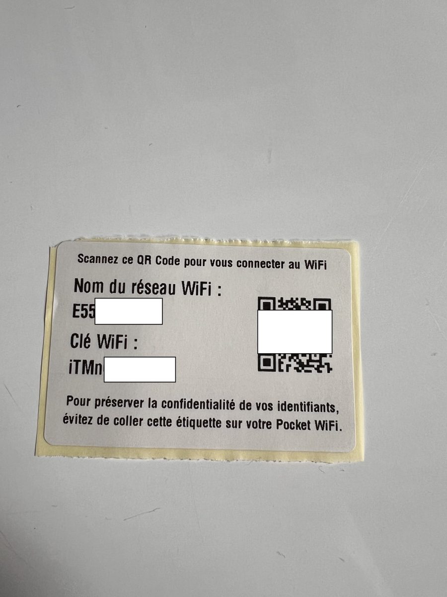 Maintenant, comment se connecter à cet appareil ? Pour cela, une étiquette vous est fournie avec toutes les informations nécessaires. Le Pocket WiFi génère en effet un réseau privé avec un nom défini et donc une clé dédiée, vous pouvez ainsi le rechercher sur votre appareil et saisir le mot de passe ou, s’il s’agit d’un smartphone ou d’une tablette par exemple, tout simplement scanner le QR Code qui y figure.