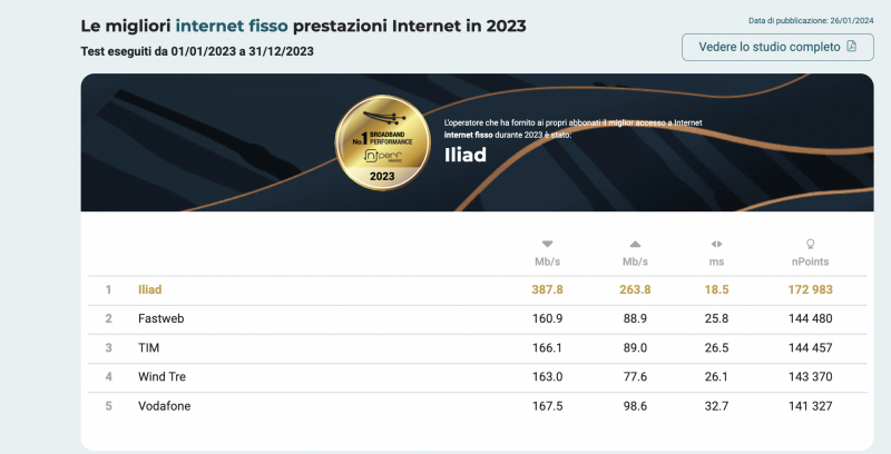 Au classement des réseaux FTTH , Iliad obtient la meilleure performance avec 578,16 Mb/s en download et 400,88 Mb/s en upload et reçoit la certification de la fibre la plus rapide du pays.