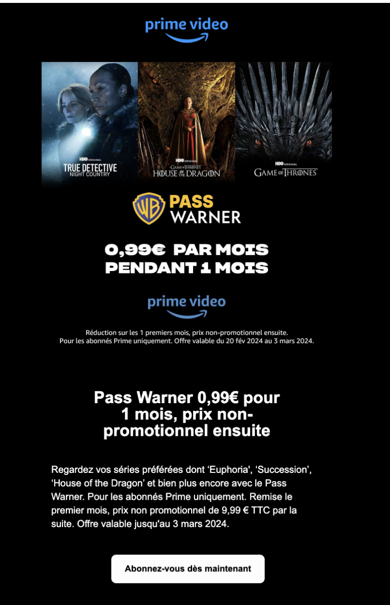 Envie de découvrir des séries adulées par la critique comme ‘Euphoria’, ‘Succession’, ‘House of the Dragon’ et bien plus encore ? Jusqu’au 3 mars prochain, Prime Video rend accessible le Pass Warner à ses abonnés Prime uniquement au tarif de 0,99€ le premier mois, “puis au prix non promotionnel de 9,99 €”, annonce la plateforme américaine actuelle dans un mail envoyé à ses abonnés.