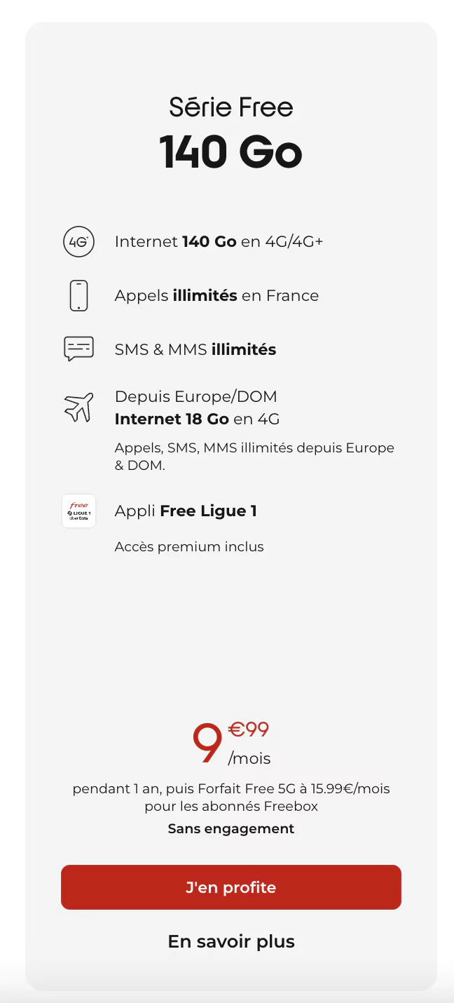 Répondre coûte de coûte aux offres de la concurrence, c’est la stratégie menée depuis plusieurs années par Free Mobile avec sa formule Série Free. Cela se vérifie une nouvelle fois ce 29 février, l’ex-trublion tient à séduire et marquer les esprits lui qui recrute plus que ses rivaux sur le segment depuis l’année 2022. Dès à présent, les nouveaux abonnés peuvent profiter d’une offre 140 Go pour 9,99€/mois pendant un, c’est mieux que la précédente qui incluait depuis début février 110 Go pour 10,99€/mois.