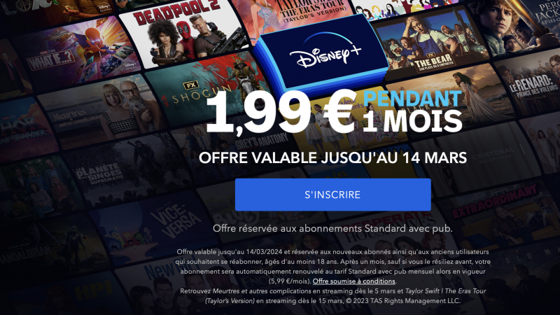 Ce sera l’occasion pour ceux qui le souhaiteraient de découvrir les nouvelles productions de Disney et de retrouver “Meurtres et autres complications en streaming dès le 5 mars et Taylor Swift | The Eras Tour (Taylor’s Version) dès le 15 mars”. Cette formule affiche une qualité Full HD, 2 écrans, sans les téléchargements. Disney+ Standard avec pub est disponible sur de nombreux comme les box d’Orange, Free, SFR et Bouygues mais aussi sur l’Apple TV, les TV connectées etc. Chez Free, l’abonnement avec pub est inclus dans l’offre Ultra et offert pendant 3 mois dans les offres Pop et Ultra Essentiel.