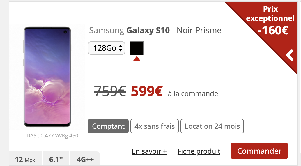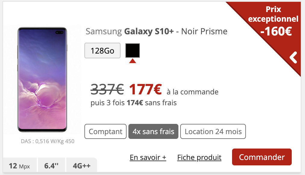 Le Samsung S10+ (128 Go) bénéficie lui aussi d’une baisse de 160€. Son prix passe de 859€ à 699€. Il faudra compter 177€ à la commande puis 3 fois 174€ sans frais.