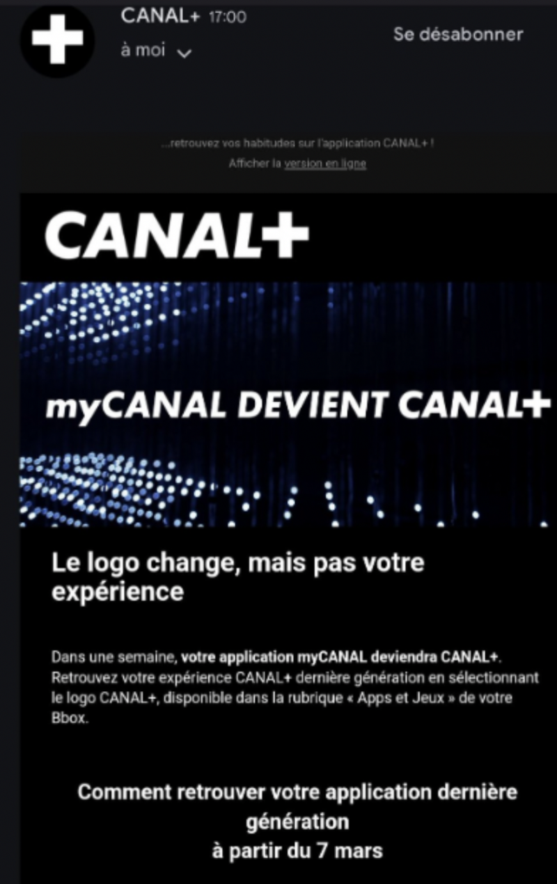 “myCANAL Canal+, le logo change, mais pas votre expérience”, tel est le message d’information transmis actuellement par la filiale de Vivendi aux abonnés Bbox de Bouygues Telecom. Ce changement de nom prendra place dès le 7 mars prochain. Sur la Freebox Pop de Free par exemple, la nouvelle appellation est déjà effective depuis longtemps. A première vue, Canal+ cherche à faire la part des choses, myCanal conserve son nom partout où une connexion se fait via des codes d’accès. A contrario, si la connexion est par exemple automatique en fonction de son abonnement, il s’agira de l’application Canal+.