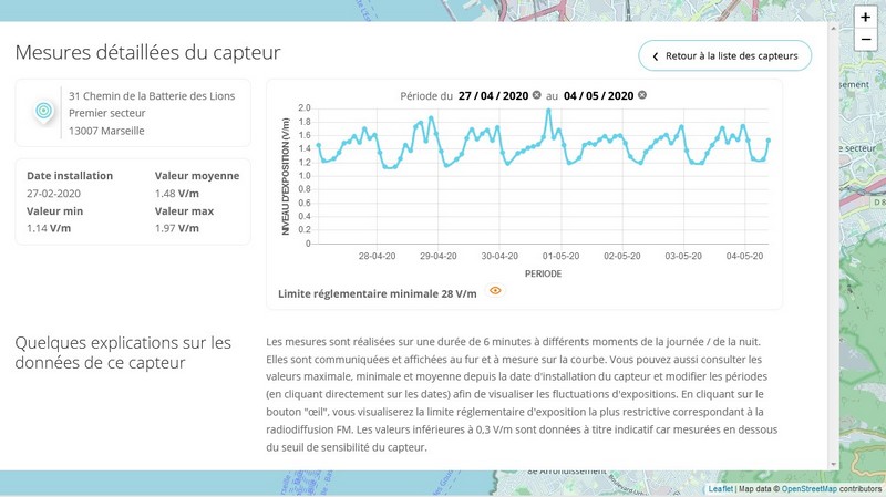 En parallèle, le gendarme des ondes a mis à disposition une carte en ligne permettant de localiser les capteurs actifs. En passant le curseur sur le capteur, on obtient la dernière mesure. Ci-dessous, les capteurs à Marseille :
