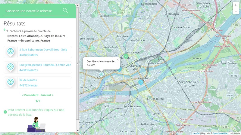 En cliquant sur la localisation du capteur, on peut accéder à des données plus précises (adresse exacte, date de mise en service, valeur minimale, valeur moyenne et valeur maximale) et consulter les historiques de mesures.