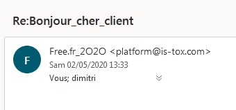 Sans compter le nom de l’expéditeur (Free.fr_2O2O), l’adresse d’expédition (platform@is-tox.com), l’intitulé de l’e-mail (Re :Bonjour_cher_client) ou encore l’adresse de la page vers laquelle pointent les liens intégrés dans le message. Décidément, notre escroc n’y a franchement pas mis du sien. Il a de grandes chances de rentrer bredouille.
