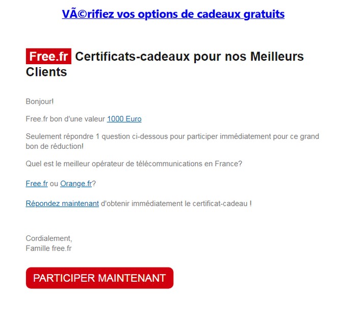 Selon un e-mail en circulation, les abonnés Free peuvent tenter de remporter un bon d’une valeur de 1 000 euros. Il leur suffit de répondre à une question. Dit comme ça, c’est alléchant.