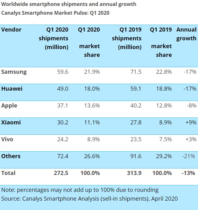Le grand survivant de ce premier trimestre 2020, en termes de ventes de mobiles, est Xiaomi. Après s’être hissé à la troisième place dans le classement des ventes de smartphones dans le monde, le fabricant chinois est le seul dont les chiffres ont augmenté de 9% avec 30,2 millions de terminaux écoulés.