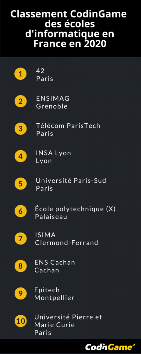 Le Top 10 des meilleures écoles formant à l’informatique en 2019 vient d’être publiée par la plateforme CodinGame, qui fédère 2 millions de développeurs répartis sur 175 pays. Ce classement est basé sur l’analyse des résultats de 9400 étudiants issus de plus de 144 écoles françaises.