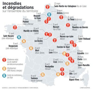 Il y a notamment le cas d’antennes-relais incendiées à Foncine-le-haut (Jura) le 16 avril ou à Plaintel (Côtes-d’Armor) le 27 avril, toutes les deux appartenant à Orange. À la liste, on peut ajouter l’antenne Free Mobile incendiée le 30 avril dans l’agglomération d’Annecy. Il y a aussi eu le cas d’un pylône de l’opérateur historique déboulonné et couché par le vent à Saint-Martin-lez-Tatinghem (22 mars).