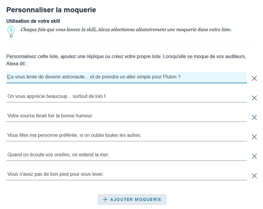 Pour un exemple plus concret, si vous voulez faire en sorte qu’Alexa puisse se moquer un petit peu de vous, pour amuser la galerie, vous pouvez sélectionner le blueprint “moquerie”. Une liste de réponses classiques d’Alexa vous sera proposée, que vous pourrez modifier et compléter avec vos meilleures punchlines simplement en cliquant sur un bouton “Ajouter moquerie”.