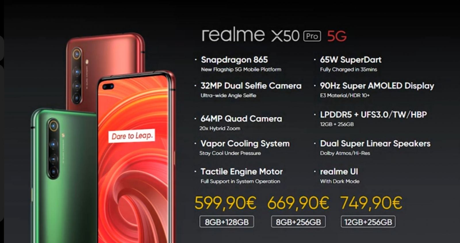 Disponible très prochainement, le premier prix du X50 Pro qui pourra être choisi en couleur rouge ou vert, sera de 599,90 euros pour sa version 8 Go de RAM en LPDDR5 et 128 Go de stockage en UFS 3.0. Une version 8/256 Go sera également proposée au prix de 669,90 euros et pour finir une version survitaminée avec ses 12/256 Go de stockage qui sera accessible au tarif de 749,90 euros.
