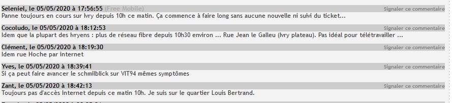 Du côté de Free, de nombreux témoignages sur le site Free-réseau.fr relatent des problèmes dans le secteur d’Ivry. Le problème semble avoir commencé le mardi 05 mai aux alentours de 10h , un timing qui concorde avec les alertes publiées par les abonnés Orange situés dans le même secteur sur les réseaux sociaux.