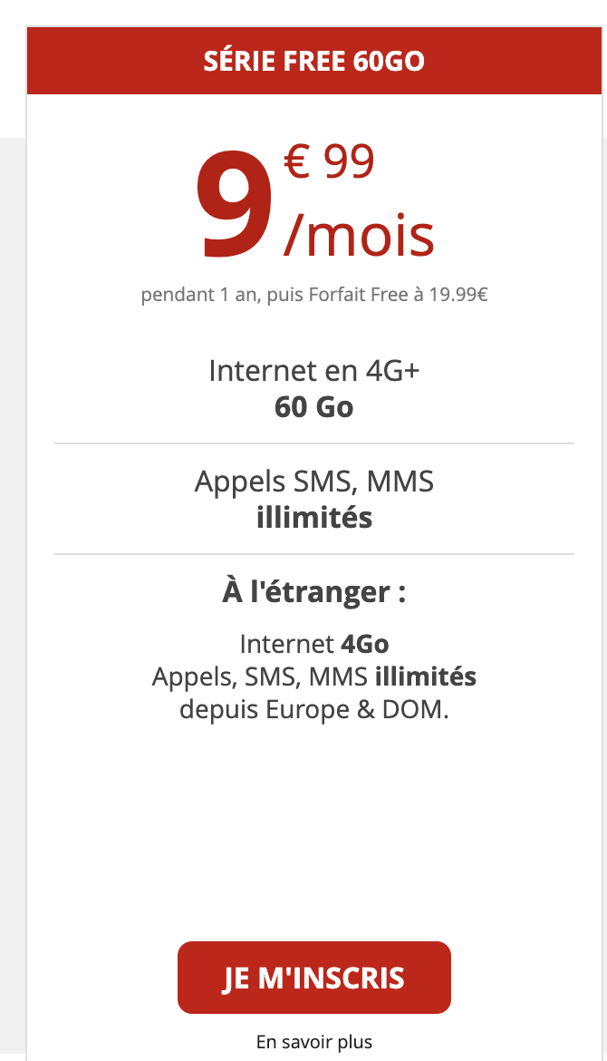 Habituellement proposé une fois par mois pendant 7 jours seulement, l’enrichissement de l’offre “Série”, joue cette fois les prolongations pendant deux semaines. Intercalé entre les deux forfaits historiques de l’opérateur, le forfait comprend ainsi jusqu’au 19 mai prochain pour 9,99€/mois pendant un an, appels, SMS et MMS illimités, 60 Go en France métropolitaine et 4 Go/mois en roaming depuis Europe et DOM en 3G et 4G. A l’issue des 12 mois, les abonnés basculeront automatiquement sur le Forfait Free classique 100 Go à 19,99€/mois ou data illimitée à 15,99€/mois pour les abonnés Freebox.