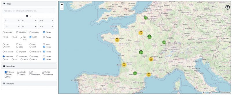 Disponible uniquement sur Android, l’application RNC Mobile a ainsi reçu, le 21 mars, une mise à jour permettant aux utilisateurs de dénicher dorénavant l’identifiant de la 5G SA durant leurs recherches en extérieur, à savoir le fameux gNB. Il est désormais possible à présent d’accéder à la carte des sites identifiés en cliquant sur le nouveau filtre dédié. Pour l’heure, 292 sites 5G SA ont été trouvés, en particulier à Paris et en Ile-de-France mais aussi à Bordeaux et sa métropole, Toulouse, Guérande, Rennes, Troyes, Belfort, Montluçon, Saint-Étienne, Roanne, Montpellier ou encore Héricourt, une commune de 10 000 habitants. Une version cette fois bêta du site web de RNC Mobile permet aussi d’accéder facilement aux informations sur la 5G autonome de Free Mobile.