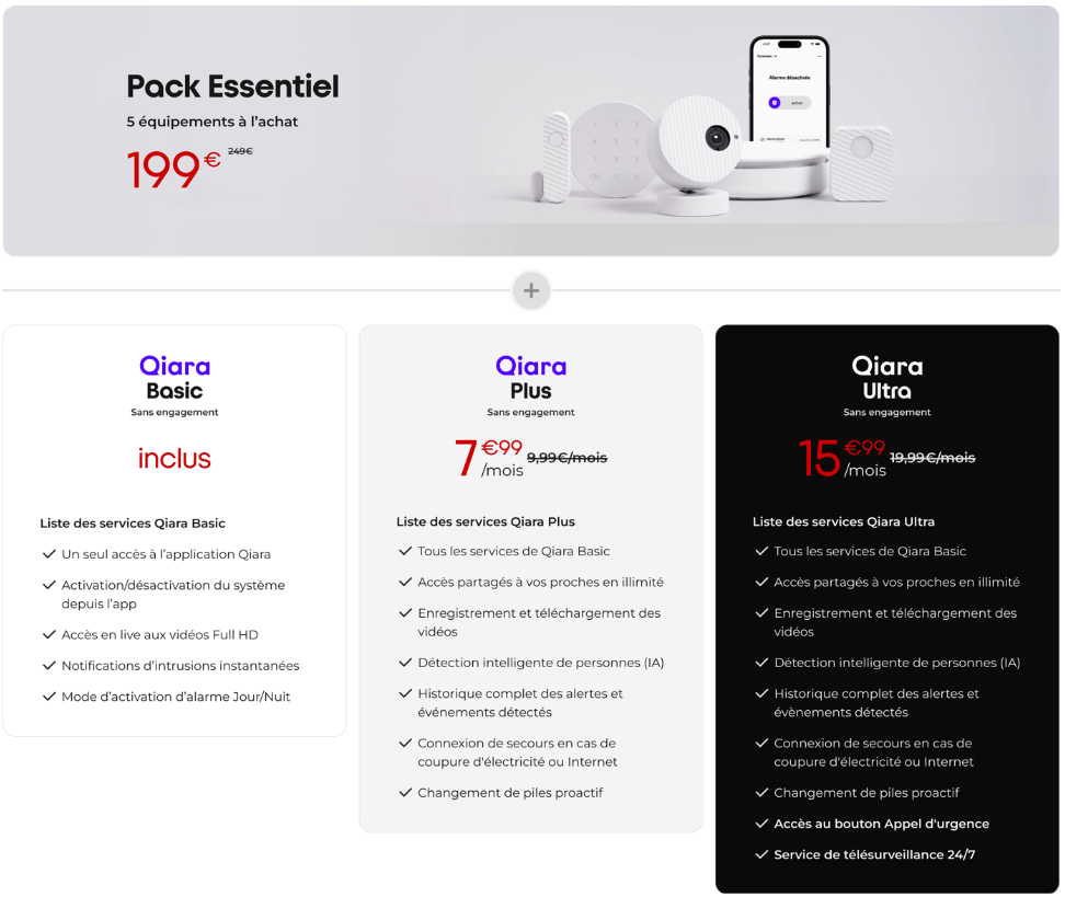 Pour 7.99€/mois au lieu de 9.99€/mois, vous pourrez ainsi bénéficier en plus de la possibilité de créer des accès partagés à l’application Qiara en illimité, enregistrer et télécharger vos vidéos, d’un service de détection intelligente de personnes via l’IA, de l’historique complet des alertes et évènements détectés, d’une connexion de secours en cas de coupure d’électricité ou internet et d’un changement de piles proactif. L’abonnement Qiara Ultra, à 15.99€/mois, propose en plus l’accès à un bouton d’appel d’urgence et un service de télésurveillance 24/7.