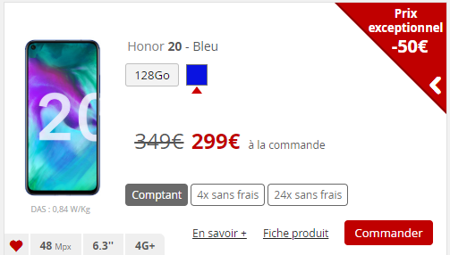 Honor 20 : Le tarif passe de 349€ à 299€ soit une remise de 50€. Cette réduction est également valable sur le paiement en plusieurs fois sans frais : en 4 fois 77€ puis 74€ durant 3 mois ou en 24 mensualités : 107€ puis 8€ durant 24 mois