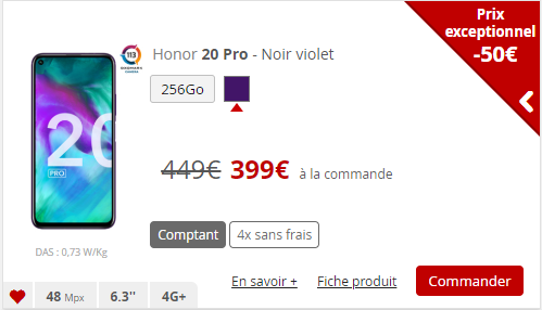 Honor 20 Pro : Le tarif passe de 449€ à 399€ soit une remise de 50€. Cette réduction est également valable sur le paiement en plusieurs fois sans frais : en 4 fois 102€ puis 99€ durant 3 mois ou en 24 mensualités