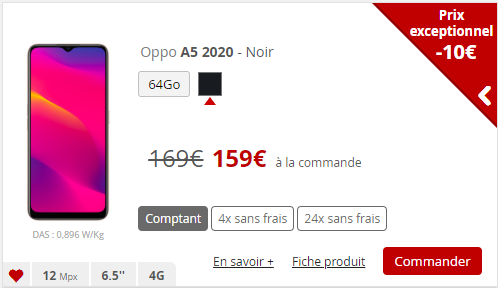 L’Oppo A5 2020 : Le tarif passe de 169€ à 159€ soit une remise de 10€. Cette réduction est également valable sur le paiement en plusieurs fois sans frais : en 4 fois 42€ puis 39€ durant 3 mois ou en 24 mensualités : 39€ puis 5€ durant 24 mois