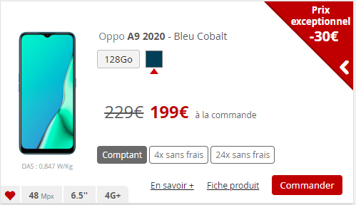L’Oppo A9 2020 : Le tarif passe de 229€ à 199€ soit une remise de 30€. Cette réduction est également valable sur le paiement en plusieurs fois sans frais : en 4 fois 52€ puis 49€ durant 3 mois ou en 24 mensualités : 31€ puis 7€ durant 24 mois