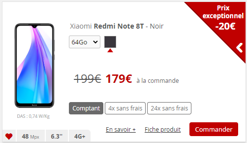 Redmi Note T8 64Go : Le tarif passe de 199€ à 179€ soit une remise de 20€. Cette réduction est également valable sur le paiement en plusieurs fois sans frais : en 4 fois 47€ puis 44€ durant 3 mois ou en 24 mensualités : 59€ puis 5€ durant 24 mois