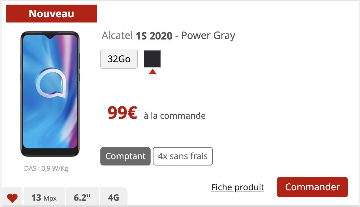 Avec un écran HD+, une batterie conséquente pour un entré de gamme, un processeur huit coeurs, Android 10, 3 Go de RAM, un triple capteur photo et une compatibilité avec la bande de fréquences 700 MHz déployée à tour de bras par Free Mobile, l’Alcatel 1S 2020 peut séduire sur le papier les petits budgets. Désormais disponible dans sa version 32 Go dans la boutique en ligne de l’opérateur, ce smartphone est proposé au prix de 99€ à la commande ou encore en 4 fois sans frais, soit à 27€ à la commande puis 3 fois 24€.