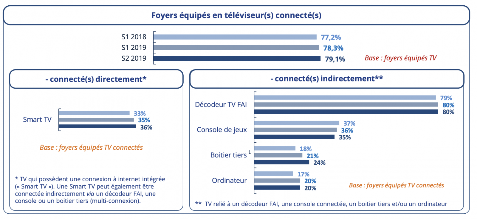 Par ailleurs, 79,1 % des Français disposent désormais d’un téléviseur connecté à internet, soit directement en tant que Smart TV pour 36 % d’entre eux ou indirectement par le décodeur TV de leur fournisseur d’accès à internet (FAI) pour 80 % de ces foyers, mais aussi par la console de jeux (35 %) ou un boîtier OTT (24 %).