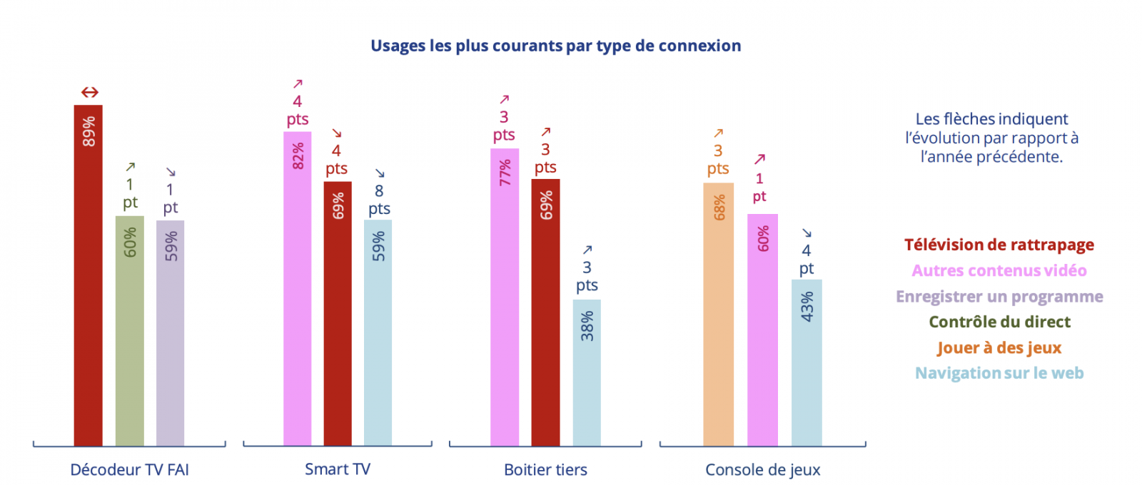 A l’heure où la connexion des téléviseurs est de plus en plus démocratisée dans l’hexagone, la télévision de rattrapage s’impose comme l’usage connecté dominant depuis les box des FAI comme Orange, Free, SFR et Bouygues. Au 2ème semestre 2019, “89 % des foyers utilisant leur décodeur TV FAI pour regarder des contenus autres que la télévision linéaire regardent la télévision de rattrapage”, constate aujourd’hui le Conseil supérieur de l’audiovisuel dans son nouvel observatoire de l’équipement audiovisuel des foyers en France métropolitaine.