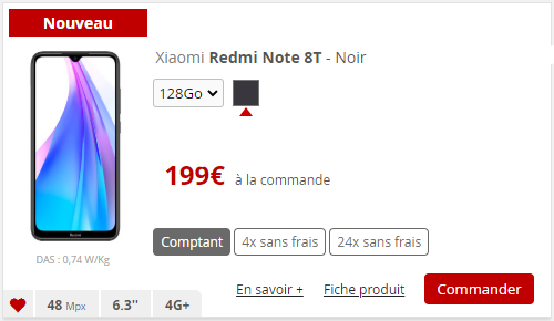 Le Xiaomi Redmi Note 8T 128Go Noir est donc proposé chez Free Mobile au tarif de 199€ en paiement comptant ou en plusieurs fois sans frais : 4 fois : 52€ à la commande puis 49€ durant 3 mois ou en 24 fois : 31€ à la commande puis 7€ durant 24 24 mois.