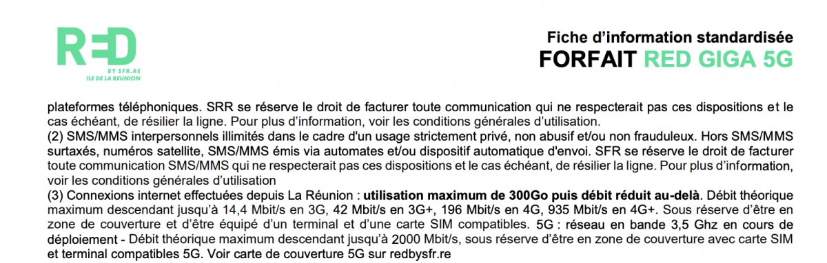 En effet, en plongeant dans les conditions générales de l’offre, on découvre un quota de 300Go/mois, au-delà duquel le débit est réduit. Une offre illimitée en data qui ne l’est donc pas vraiment, mais qui a le mérite de la transparence. Contrairement à un autre opérateur local, SFR Réunion joue la carte de l’honnêteté en indiquant clairement cette restriction dans ses CGV.