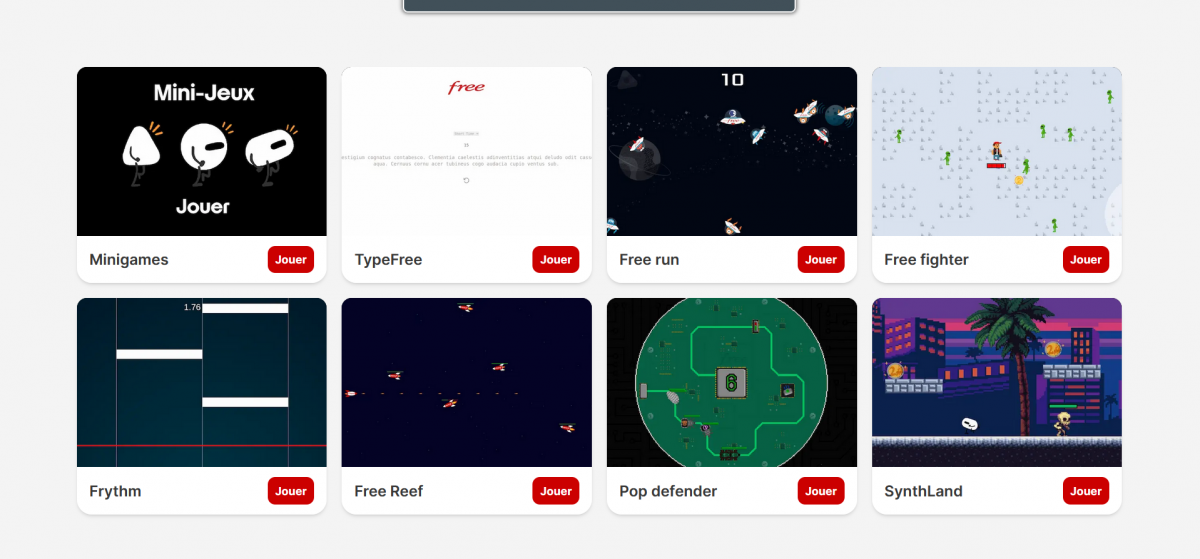 Si vous êtes un peu trop loin de Lieusaint, où Free vient d’ouvrir son concept store “Free to Play” qui propose une expérience ludique aux abonnés et visiteurs, vous pouvez la retrouver en partie sur votre navigateur. En effet, Free met à disposition de nombreux jeux disponibles sur cette page, et vous pouvez ainsi les essayer et comparer vos scores avec l’ensemble des participants. Aucune réelle connexion n’est demandée, il vous suffit d’entrer un pseudo et vous aurez accès à 8 titres gratuits.