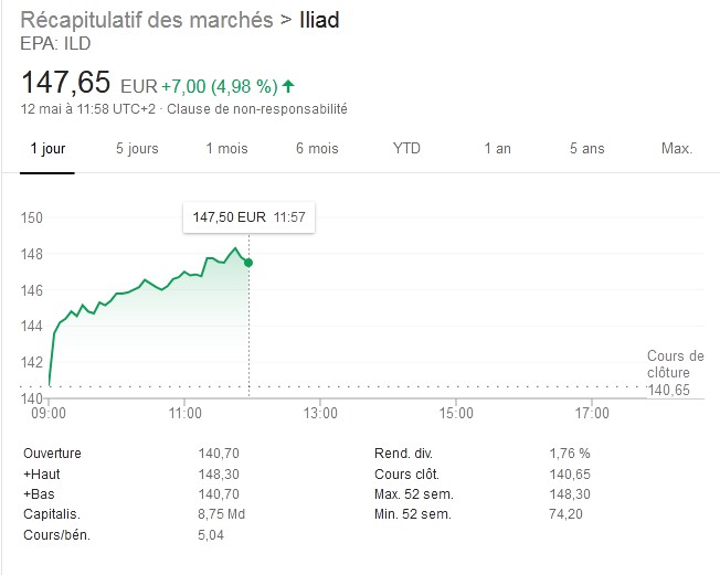 Avec des résultats conformes aux attentes et de belles perspectives, les résultats d’Iliad ont été bien accueillis par les investisseurs. Le titre du groupe se retrouve ainsi 147,65 euros à l’heure où sont écrites ces lignes, en hausse de 4,98 % (+ 6,95 euros) depuis l’ouverture et de 26 % depuis le début de l’année, il atteignait une valeur de 116,70 euros.