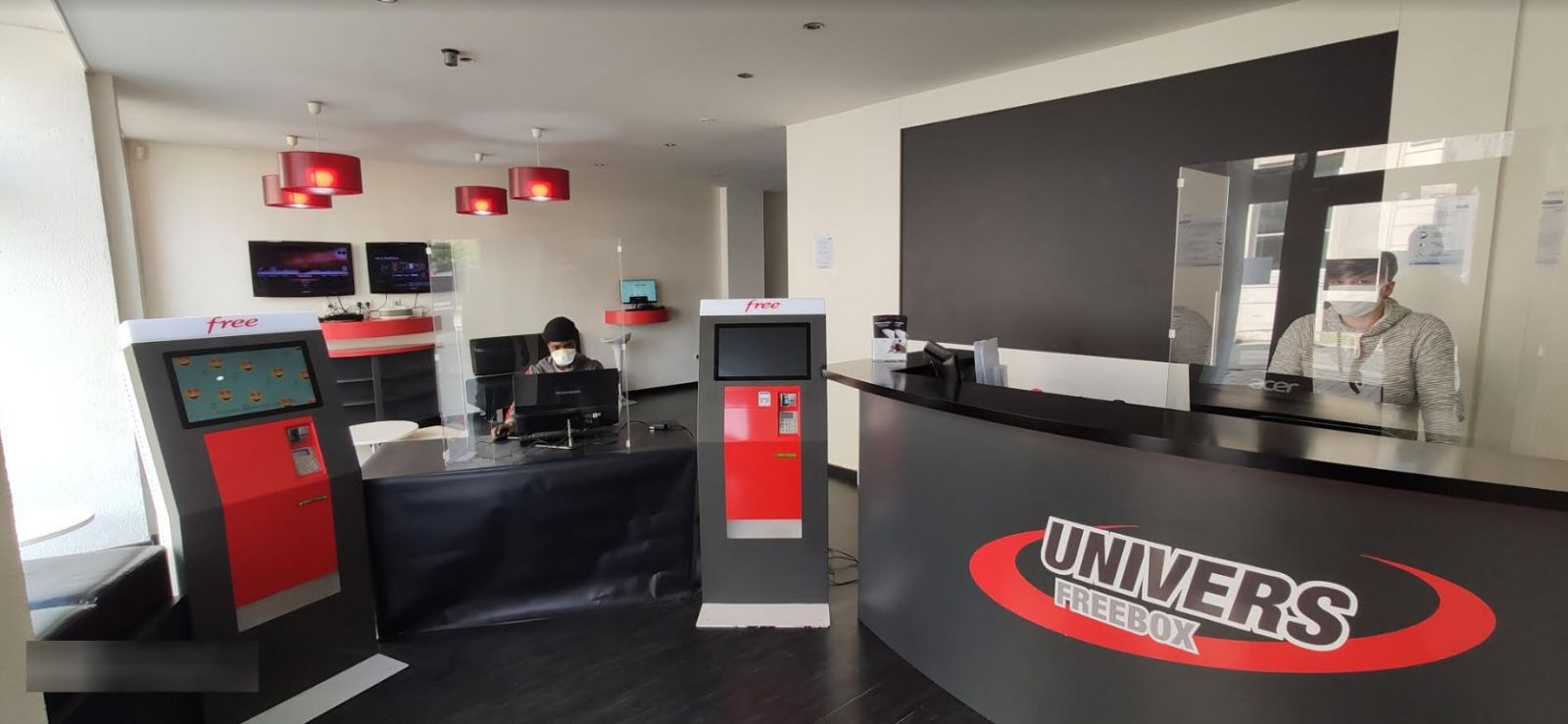 Nos animateurs numériques quant à eux vous accueilleront derrière des parois en plexiglas et porteront un masque, ainsi que des gants s’il devait y avoir une manipulation de votre Freebox ou de votre téléphone. Des lingette désinfectantes seront à disposition pour utiliser les bornes automatiques.