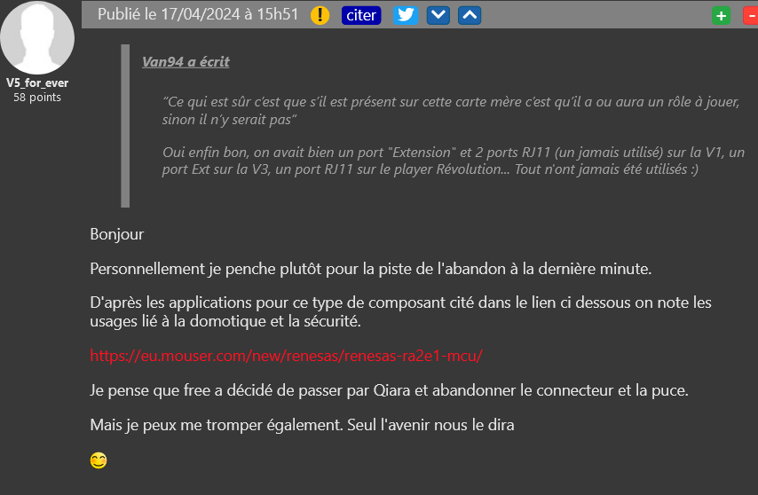 A quoi sert donc cette puce ? C’est la question que se pose le youtubeur et ingénieur Deus Ex Silicium dans sa vidéo d’analyse de l’électronique de la Freebox Ultra. S’il a su identifier l’ensemble des composants présents sur la carte mère avec assez de précision, sur la face arrière, il est tombé sur une puce dont la présence est “intrigante“. Si le modèle en lui-même est connu, à savoir un micro contrôleur 32bits ARM Cortex cadencé à 48 MHz, de la famille RA2E1 du fabricant Renesas, son utilité l’est beaucoup moins, ce qui pousse forcément certains à tenter de deviner à quoi il sert.